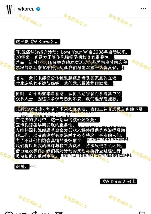 (图源见水印) 不过,也有一些粉丝为自己的偶像辩解,认为都是主办方的锅。 拜托,粉丝能不能别洗了,他们作为公众人物难道没有一点思考能力吗?还是说他们明知道是慈善晚会,但还是一毛不拔,只当吃喝玩乐去了? 退一万步讲, 如果这次活动没有翻车,他们就是妥妥的既得利益者 ,收获热度和讨论度的同时,粉丝还会大吹特吹“我哥哥姐姐人美心善”。 追星可以,但最好带点脑子吧。 引发争议后,WKorea发文道歉,并删除了今年活动的所有内容,称 “会以此次事件为契机,重新审视并检查活动策划与执行的全过程”。